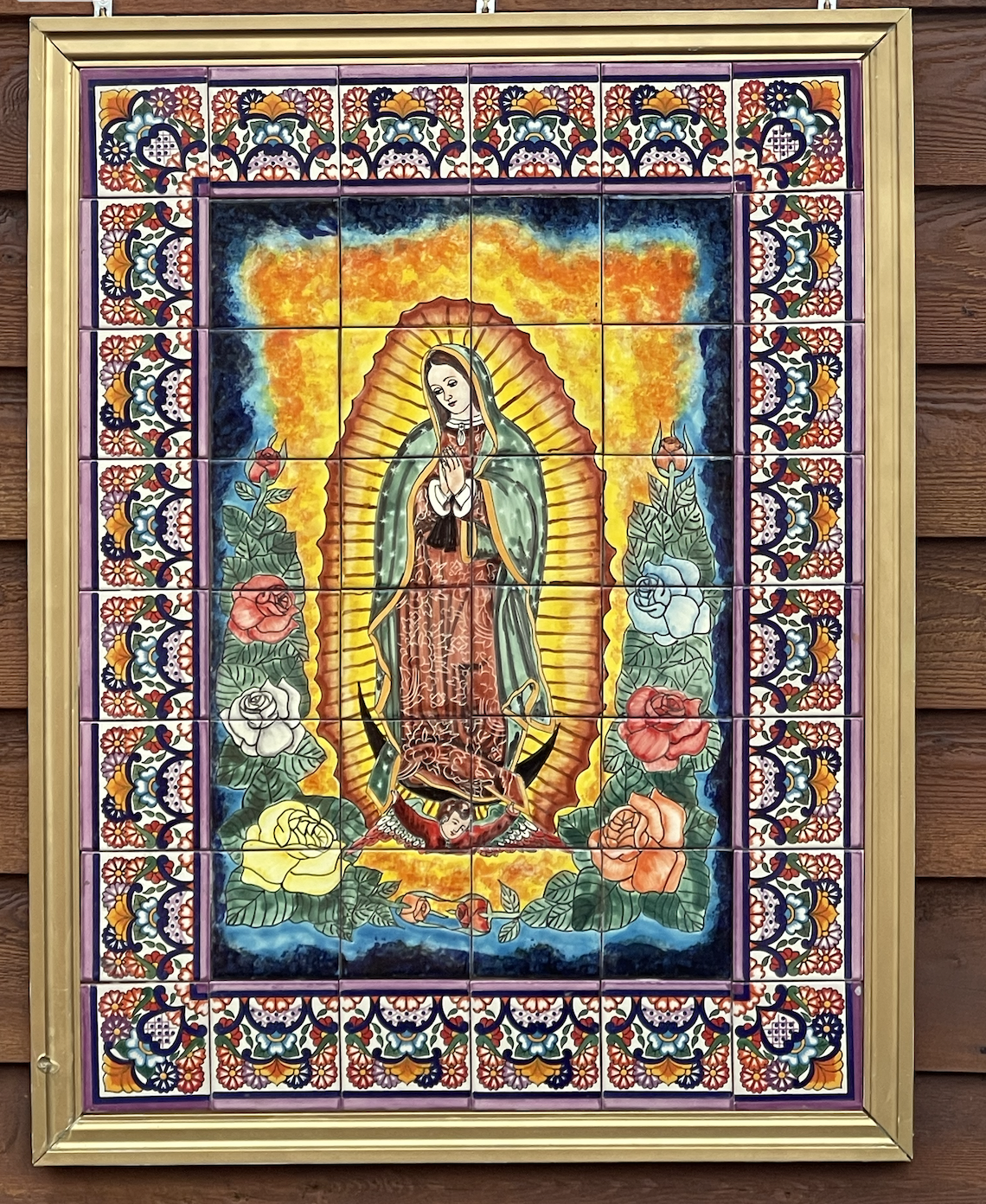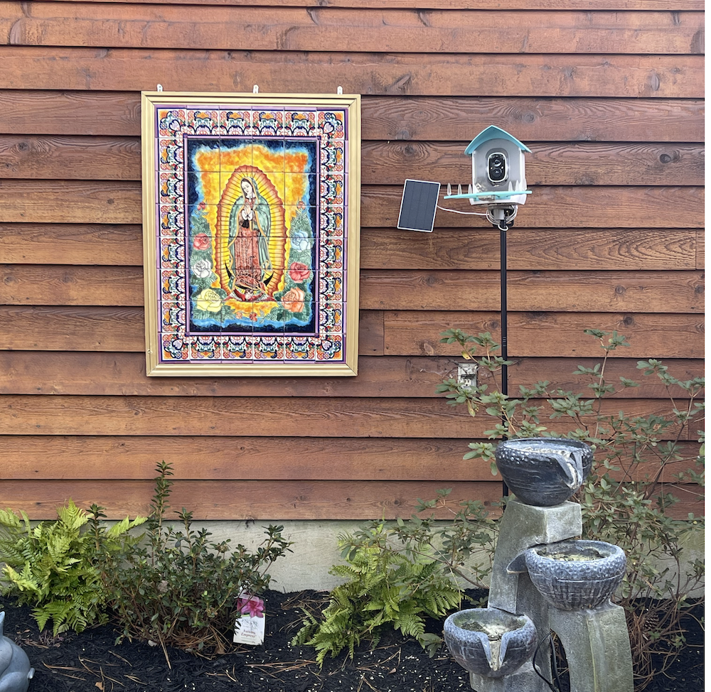 A few months ago, I ordered some tiles from Mexico that comprise a mosaic of the image on the Tilma. I had my friend (who is from Mexico) assemble, mount, and frame the tiles so I could create a garden with the image as the focus. Eventually, I’ll have ivy plants growing around the frame so it doesn’t look so stark, and the garden beds will fill out.